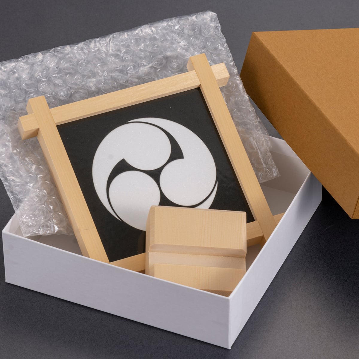 日本の伝統工芸である組子細工と伝統文化である家紋が調和した、家族を象徴する置物です。