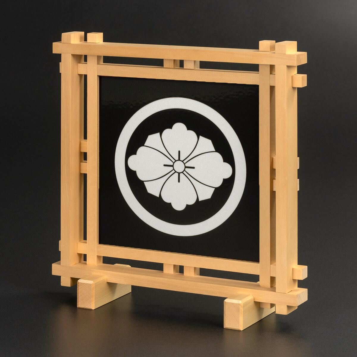 ▶素材:木(米ヒバ)、ホーロー(ガラス化粧金属板。家紋部分に微細なラメ入り)、ステンレス(家紋パネル裏面の吊環部分)