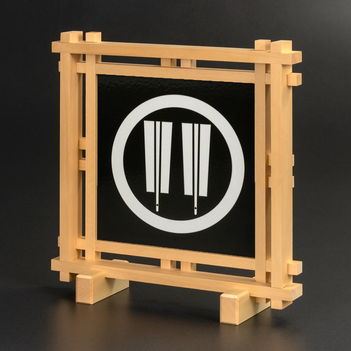 ▶素材:木(米ヒバ)、ホーロー(ガラス化粧金属板。家紋部分に微細なラメ入り)、ステンレス(家紋パネル裏面の吊環部分)