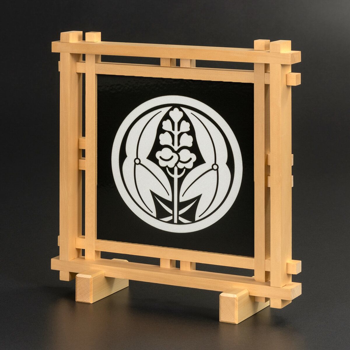 ▶素材:木(米ヒバ)、ホーロー(ガラス化粧金属板。家紋部分に微細なラメ入り)、ステンレス(家紋パネル裏面の吊環部分)